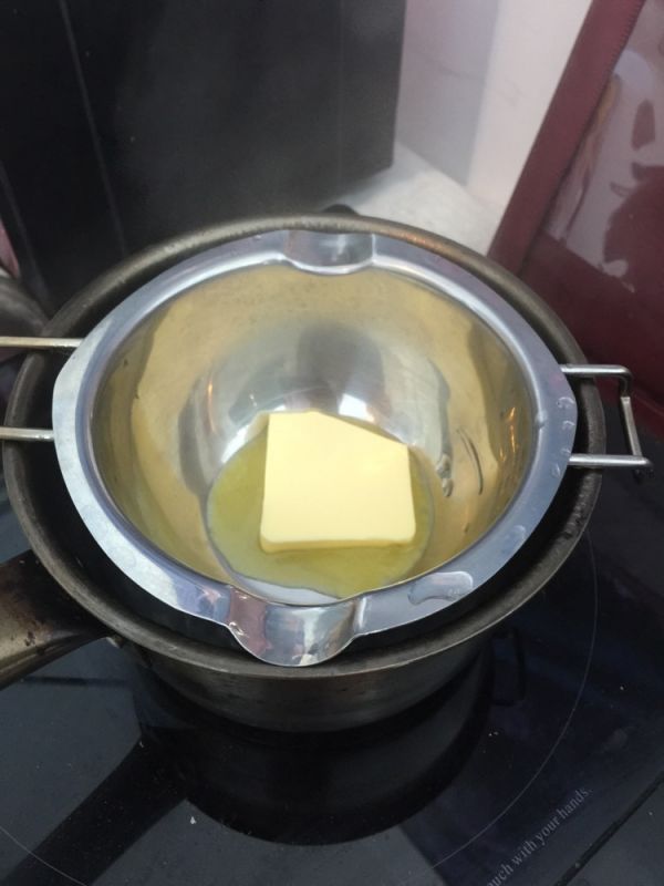 把黄油加入蛋糊,再把面粉糊倒入蛋糊。拌匀。