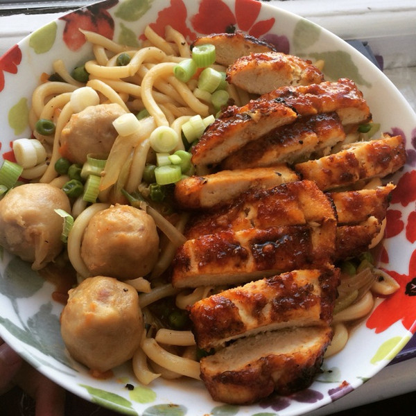 烤好的鸡排切块放在面上 切小葱点缀