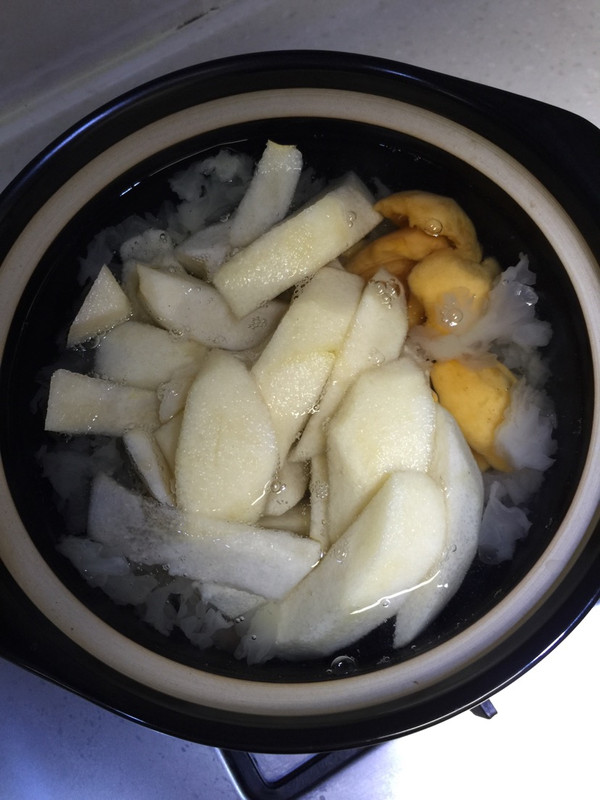 雪耳锅内重新加入适量清水烧开后,将枇杷、雪梨加入继续煲30-45分钟。