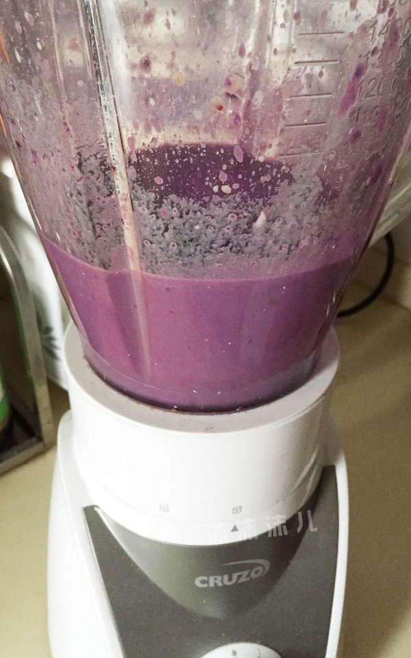 搅打1分钟,成为粘稠的糊状,静置半小时。(如果没有食品料理机,可以将蒸熟的紫薯切块后用勺子碾压成泥,再加入其他配料拌匀)