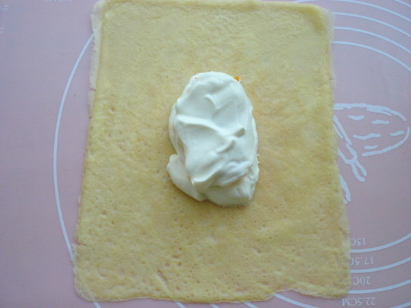 冷藏后的班戟皮光滑的一面朝下,放淡奶油。