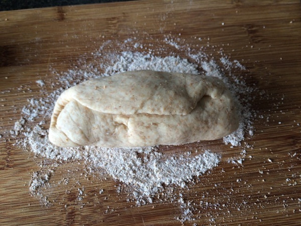 把面和提子卷成一团后,将收尾处朝上,另一面粘上杂粮面粉
