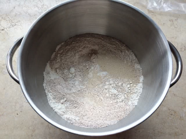 高筋粉+杂粮粉+酵母+盐全部倒入搅拌缸内