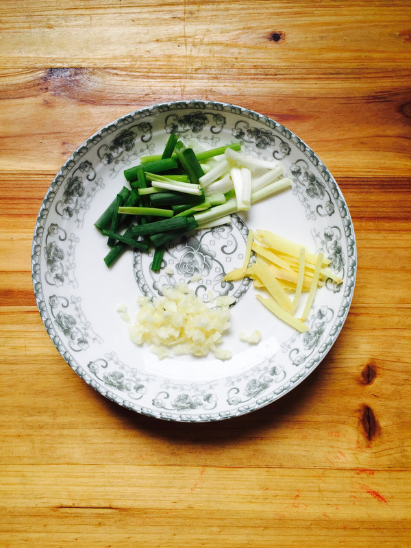 香葱切段,姜切丝,蒜子拍碎切成蒜米。