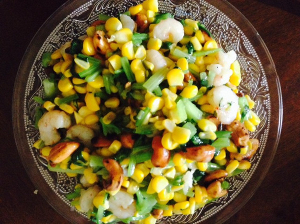 翻炒: 锅内放入少量植物油,预热,无需加入其他配料。 待油稍微预热后放入芹菜和玉米翻炒,适时加入虾仁和腰果。 翻炒两至三分钟即可,加入适量咸盐,出锅前也可加入少许鸡精。 然后关火出锅即可。 (我这里虾仁放少了,玉米放多了,显得有点悬兵夺主,不过不影响味道,各位根据自己的喜好添加)
