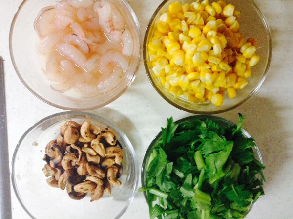 备料: 虾仁,加适量糖、料酒,淀粉腌渍10分钟,注意料酒和淀粉不要放的太多,均匀包裹虾仁即可。 腰果,可根据个人口味选择用油炸或者干锅翻炒,油炸更香,干锅不易上火。这里以干锅翻炒为例。 芹菜,切成小丁,带适量叶子点缀。 玉米/白果,玉米在正式翻炒前需要用水焯一下,如选择白果,则无需此步骤