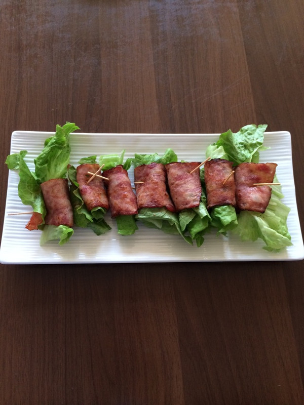 生菜洗净,擦干水份,培根煎好,和生菜卷好,为了定形,用牙签固定。0k了