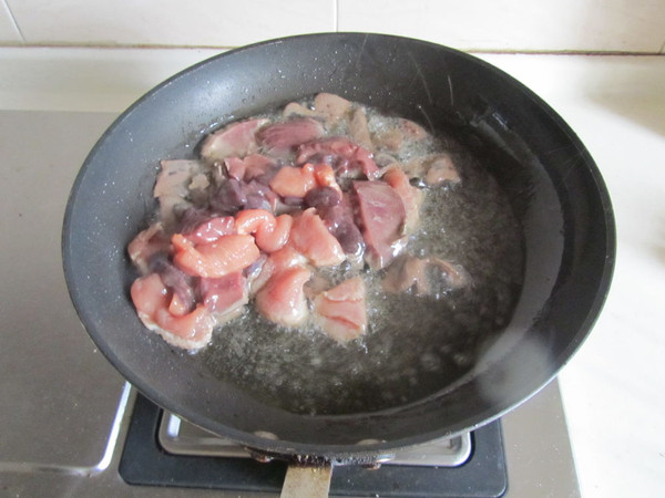 锅中倒入比平时多点的油, 下入三样原料滑炒,;