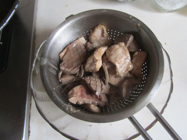 猪腰去除中间白色的筋膜,再在表面打上花刀, 切成小块;