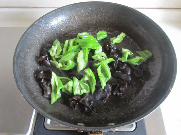 锅中留少许底油, 放入黑木耳和青椒翻炒;