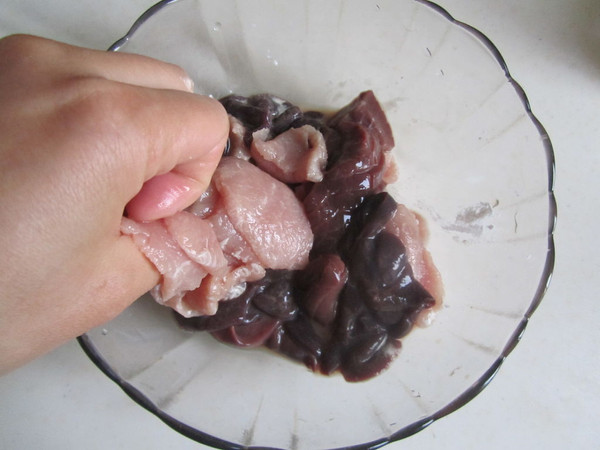 清洗过的猪腰和猪肝控干水,加入盐、料酒和水淀粉;
