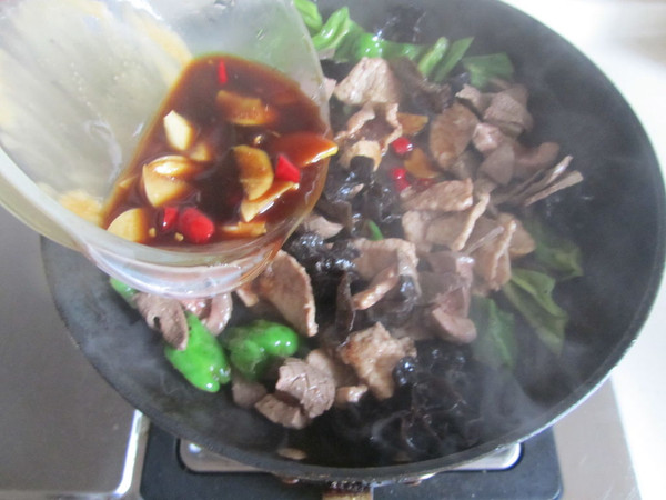 青椒稍软后下入刚滑过的三样原料翻炒;