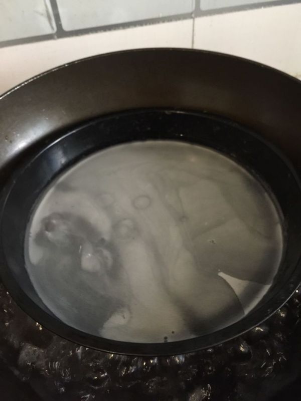 锅烧开水保持小火,准备一个不锈钢盘,舀一勺粉浆入盘中,转匀(布满盘疷就行),等液体变白,倾斜盘子,让沸水流入盘中。