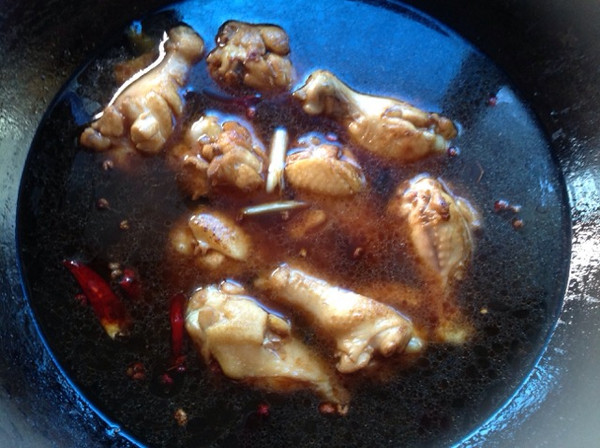 再放入干辣椒、花椒、老抽、糖把鸡腿翻炒
