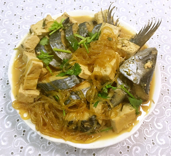把鲅鱼豆腐粉条盛入盘中再撒入少许香菜别有一番滋味在口中!