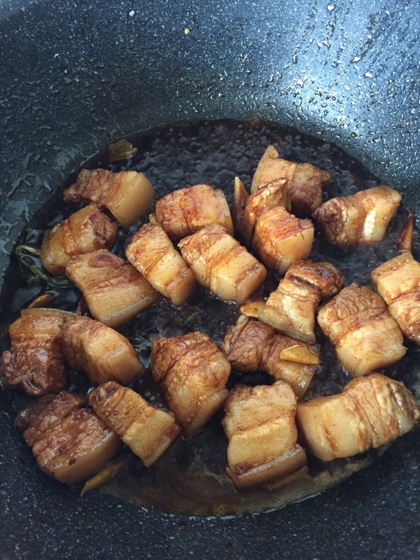 加入2汤匙红烧汁或老抽,让肉再上色,之后加黄酒3汤匙。