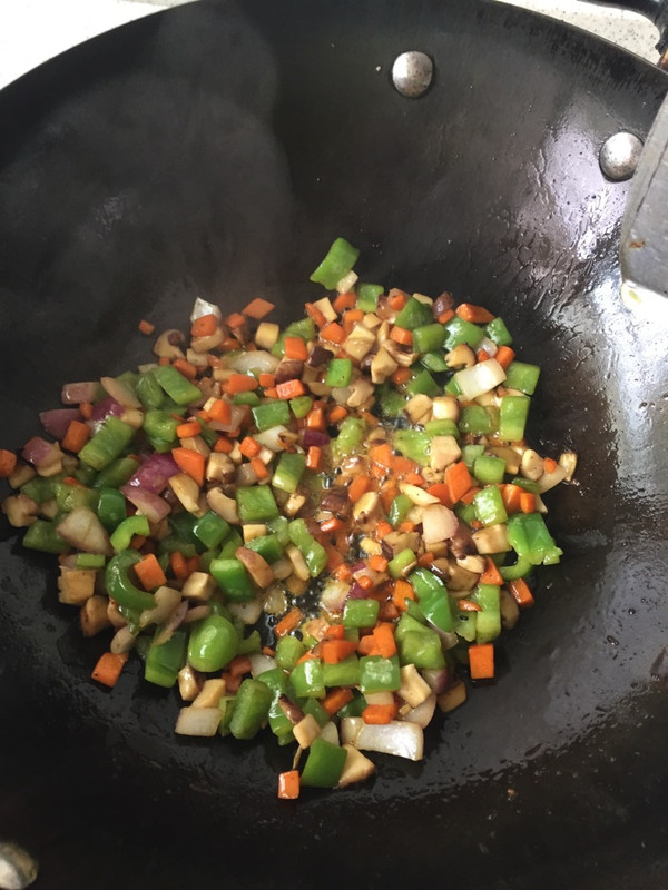 锅里在放油烧热,放入胡萝卜,煸一会再放入洋葱,菜椒,香菇爆炒,放入肉丁再炒出香味~
