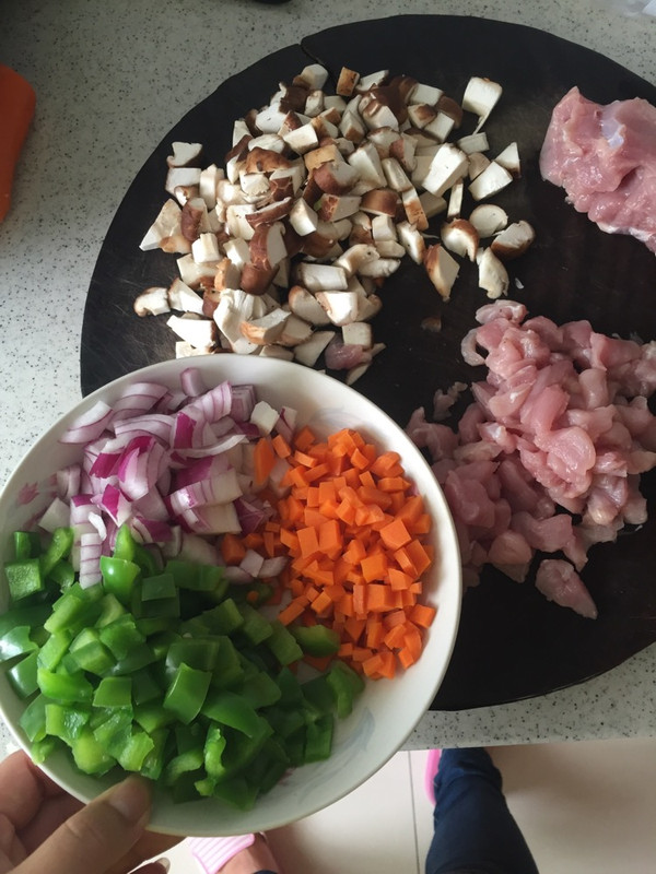 各种切好,肉丁可以再切小一点~油锅烧热放入生姜丝,蒜头片爆香捞出,油锅继续炒肉丁,再点一点料酒炒到半熟盛起来备用~