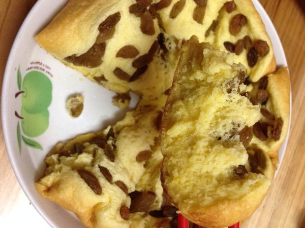 电饭煲先用油涂下底,以免糊锅,先预热一分钟,然后倒入刚刚的材料,按煮饭,其实差不多半个小时,我是中途翻开盖子,放葡萄干的,如果先放的话就沉底部了,人容易糊掉…我试过,蛋糕底部的葡萄干全部糊掉