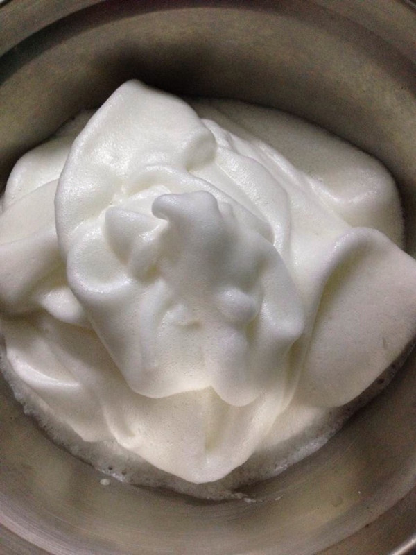 蛋黄蛋白分开,蛋白加一勺糖,半勺盐,开始搅拌,打到有点稠的时候加多半勺盐,继续打,手打的话大概十几分钟就可以打成图示,舀起来不会掉下去,就好了