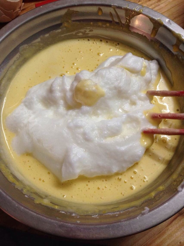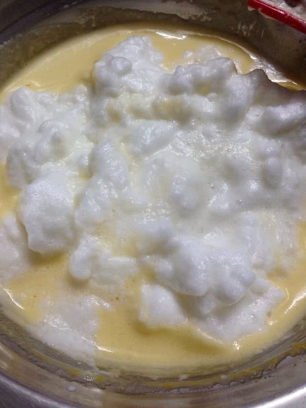 搅拌好的蛋白分俩次加入蛋白,每次搅拌均匀再加下次