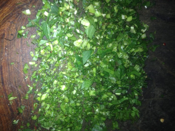 韭菜,老缅芫荽,芫荽切碎。