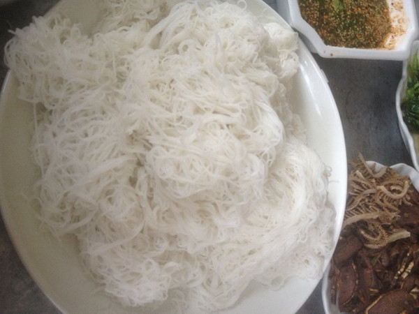 干米线下锅烫软备用、(买不到干米线的地方可以用细粉丝泡开煮了过凉水备用)