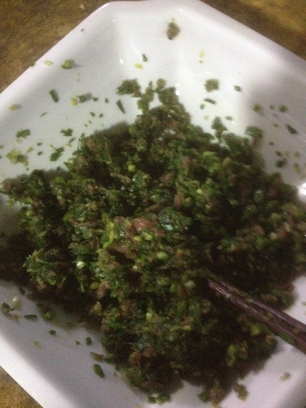 牛肉末和韭菜末一起舂。舂到混合在一起了放碗里。