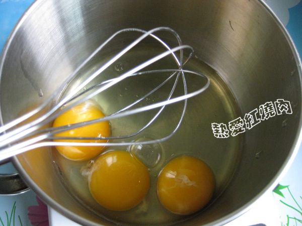 三个鸡蛋磕入碗中用打蛋器打散