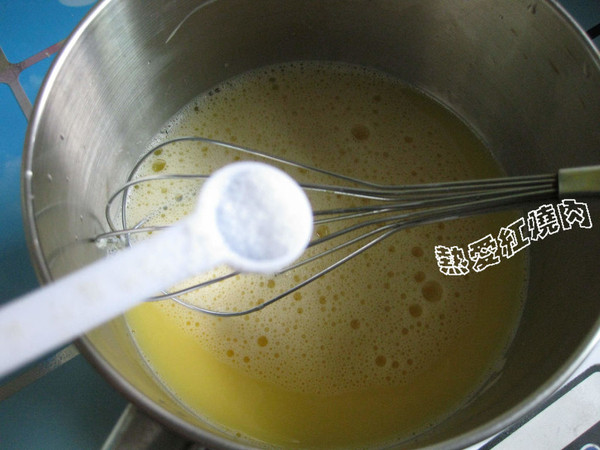 然后将80度的热水慢慢的细细的倒入鸡蛋液里,一边倒一边不停搅拌.(千万别给弄成蛋花汤哈。)