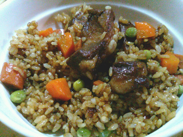 把大米,胡萝卜,豌豆,煮好的排骨及汤(去掉八角)均放入电饭煲内,水大约没过米饭一指。煮熟后闷10分钟。浓香四溢。