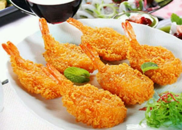 面包虾 主料:大虾 附料:面包糠,姜,鸡蛋,面粉 调料:广东米酒(花雕酒),盐,味精 做法:把虾去皮,留尾巴。然后大虾拍生粉,用杆面仗把虾敲大。随之拍面粉,在拍鸡蛋,然后再拍面包糠即可。油温6-7成把虾下锅,炸熟以后捞出,然后油祸加热再次放入炸好的虾。炸至金黄色捞出。