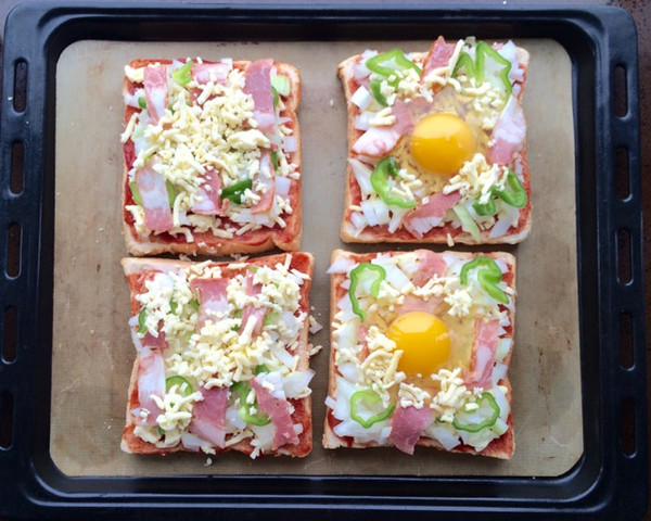 培根版的(图中左上和左下)均匀放入洋葱,每片上放4块青椒,和6块培根,最后撒上芝士 培根加蛋版的(图中右上和右下)将洋葱撒在四周,这里也可以选择放一个洋葱圈,而不用洋葱碎,四角放上青椒,两块青椒中间放一块培根,面包片中间形成的凹陷处打入一个鸡蛋(鸡蛋打散口感更好),最后撒上芝士