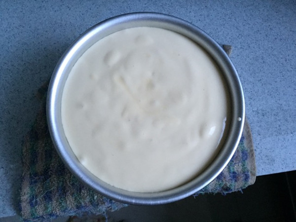 把模具在垫了抹布的台面上从10公分左右的高度落下震动几次,以震出大气泡。看,现在变得细腻均匀的蛋糕糊。