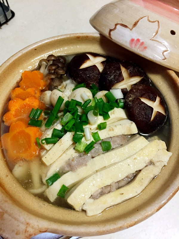白萝卜去皮切薄一点的大圆片铺底,胡萝卜去皮用模具切花,豆腐两片切到底部相连,中间抹上加了料酒、盐、一点淀粉的肉沫。香菇切花。所有料摆好。锅里倒入少量水,因为开煮后菜都会出水。撒上盐、鸡精。