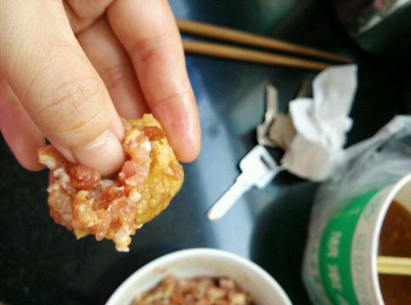 直接用手塞一小块儿肉,不要用筷子或勺子弄,非常难操作。