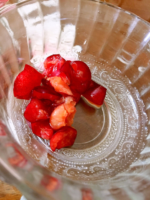 动手把樱桃籽和把儿都去掉,最好带个一次性手套,不然会把手指染黄,把每个樱桃掰成大约四五块就可以了。