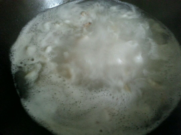 往锅中加入温水,不要开水,放开水汤就不会是诱人的乳白色,放凉水,鱼肚就发脆,口感不好,所以放温水!