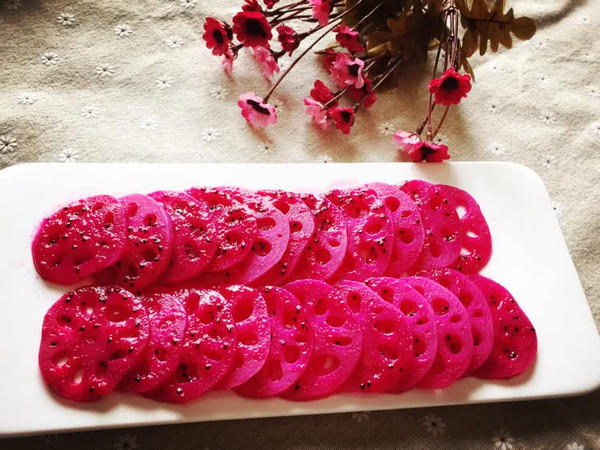 把藕放入大碗中,倒入火龙果泥,放入适量蜂蜜,包上保鲜膜放冰箱冷藏3小时以上
