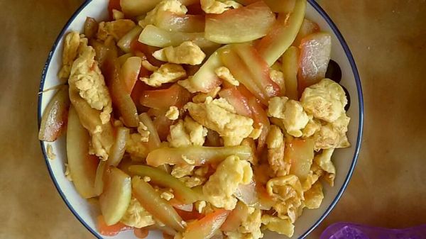 3.锅里放少许油,油热放葱花,把西瓜皮倒入,翻炒到西瓜皮变软,放一小勺盐,鸡精一小勺,味极鲜酱油少许,翻炒两下,放入鸡蛋,再翻炒均匀出锅。