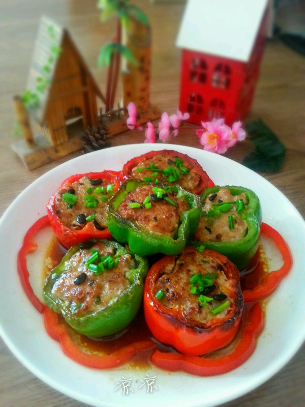 将肉拌匀逐一将肉塞进圆椒肉,尽量塞满些。锅下油,烧的很温,中小火,这时将酿好的彩椒有肉那面朝下,用慢火煎成黄色收口(注意锅很容易浅油手和脸,要小心)彩椒煎好后下豆豉,接着下温开水未过椒面,大火煮开,中小火焖至快收汁时下盐少许,生抽少许,白糖少许(也可下鸡精)再小火焖一下就出锅。