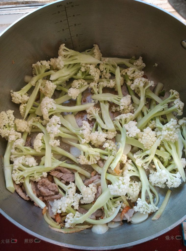 再将有机花菜放入锅里翻炒,直到花菜断生变色为止。电磁炉一直是火锅档800瓦的火。