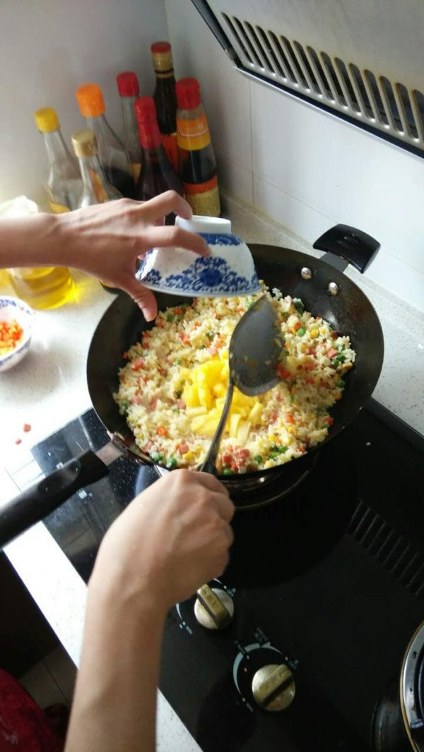 2、鸡蛋打散,把蛋液倒入米饭,拌匀备用。 青豆、玉米粒、胡萝卜丁放沸水里焯一下断生,捞起备用。 锅内加油,倒入拌好的米饭翻炒,加入青豆、玉米丁、胡萝卜丁和香肠丁继续翻炒。 快熟的时候加入菠萝丁翻炒,再加入椰汁、盐调味。