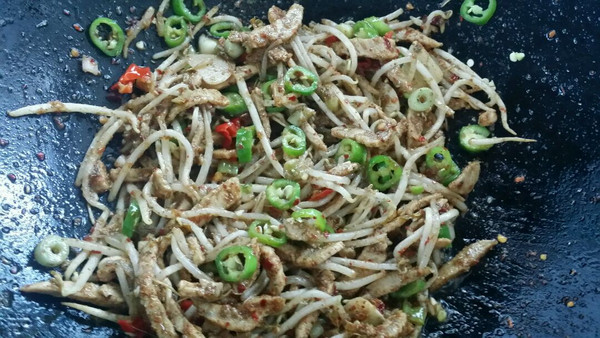 炒锅上油炒肉丝到变色