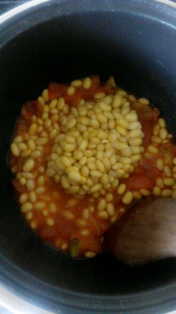 番茄炒化后加黄豆,盐,酱油,鸡粉,糖,没过黄豆的水,大概两碗