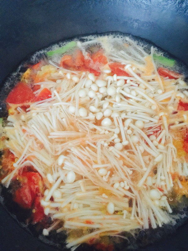 水开加入番茄,番茄皮熟后会脱落,捞出来,加入金针菇