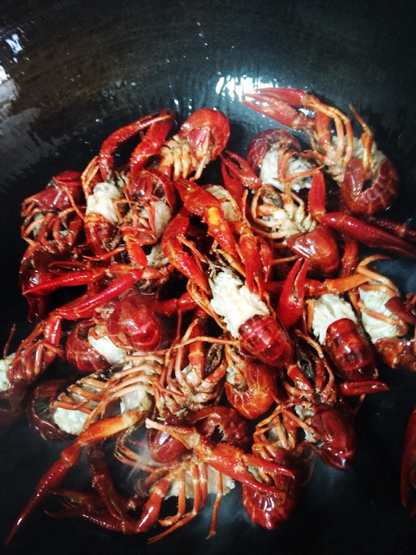 过中油烧热把腌好的龙虾入锅翻炒片刻乘出备用