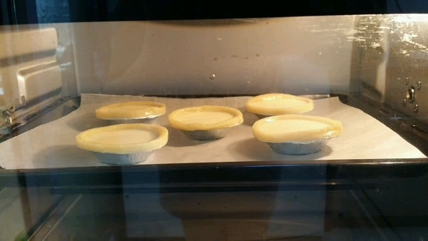 把蛋挞水倒入蛋挞皮中,8分满即可。烤箱预热, 上下管200度,预热15分钟