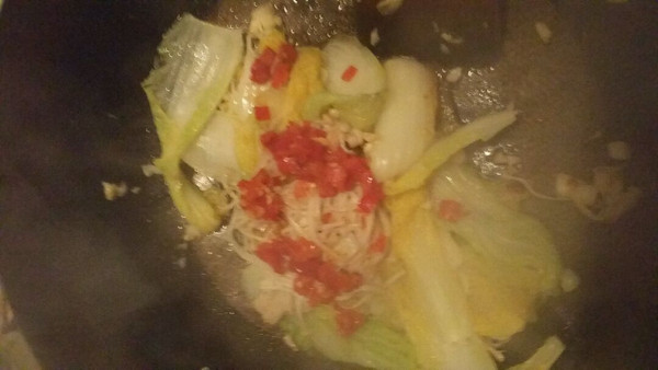 然后放入剁椒(在超市买的剁椒罐头,比较方便,直接倒进锅里)、盐、鸡精,继续翻炒 2—3分钟