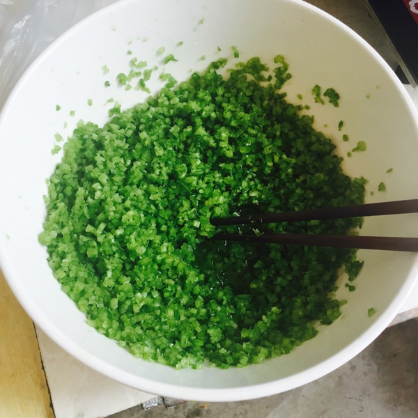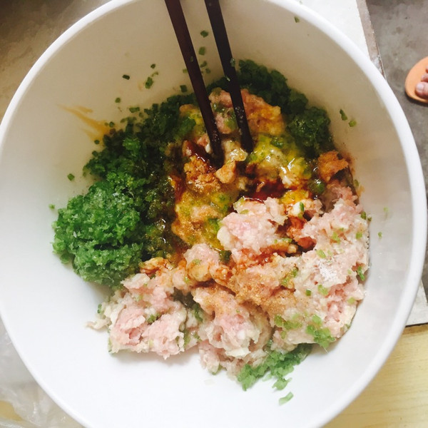将绞好的肉馅和捏好水分的芹菜混合在一个碗里。